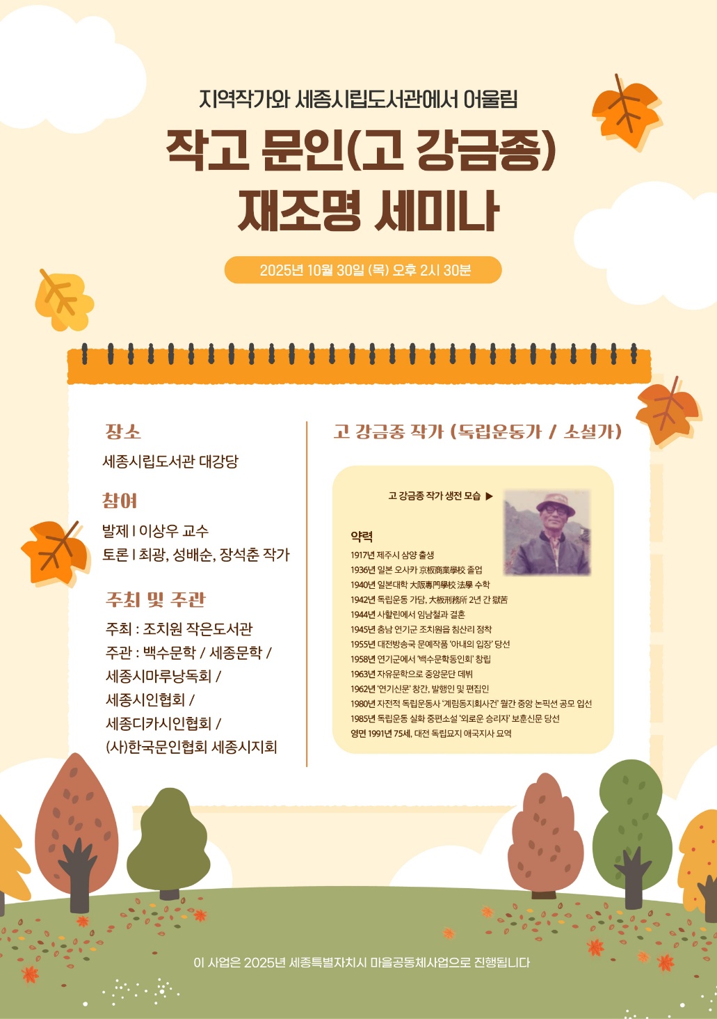 -세종시 강금종 작가를 중심으로이 내용은 2025년 10월30일 오후2시30분 세종시립도서관에서 발표할 발제 내용입니다.관심있는 분들의 많은 참석을 부탁드립니다.Ⅰ. 서론 지역의 시대가 강화되면서 지역의 상징성과 문화적 정체성 정립의 필요성도 부각되 었다. 특히 문화인물의 영웅담, 생애사 등의 발굴과 재조명을 통한 활용은 그것이 현재 의 삶과 결합됨으로써 지역의 상징 강화, 지역정체성 형성, 지역문화의 매개로 작용한 다. 하지만 발굴되고 생산된 많은 지역문화 자료들에 대해 잘 모르고 있거나 활용되지 못하는 경우도 많다. 이런 연유로 지역문화 자료에 대한 대중의 접근성을 높일 수 있 는 방안이 필요하다. 이는 문화의 시대, 지역 문화인물의 발굴을 통한 아카이빙의 필요성이기도 하다. 예 를 들어 세종특별자..